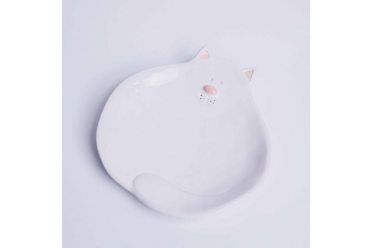 Ceramiczny biały talerzyk deserowy w kształcie kota, z kocimi uszkami, zawiniętym ogonem i uśmiechem. Talerzyk może służyć do podawania drobnych potraw, słodyczy, przechowywania niewielkich rzeczy, jako mydelniczka lub podstawka na świece.
