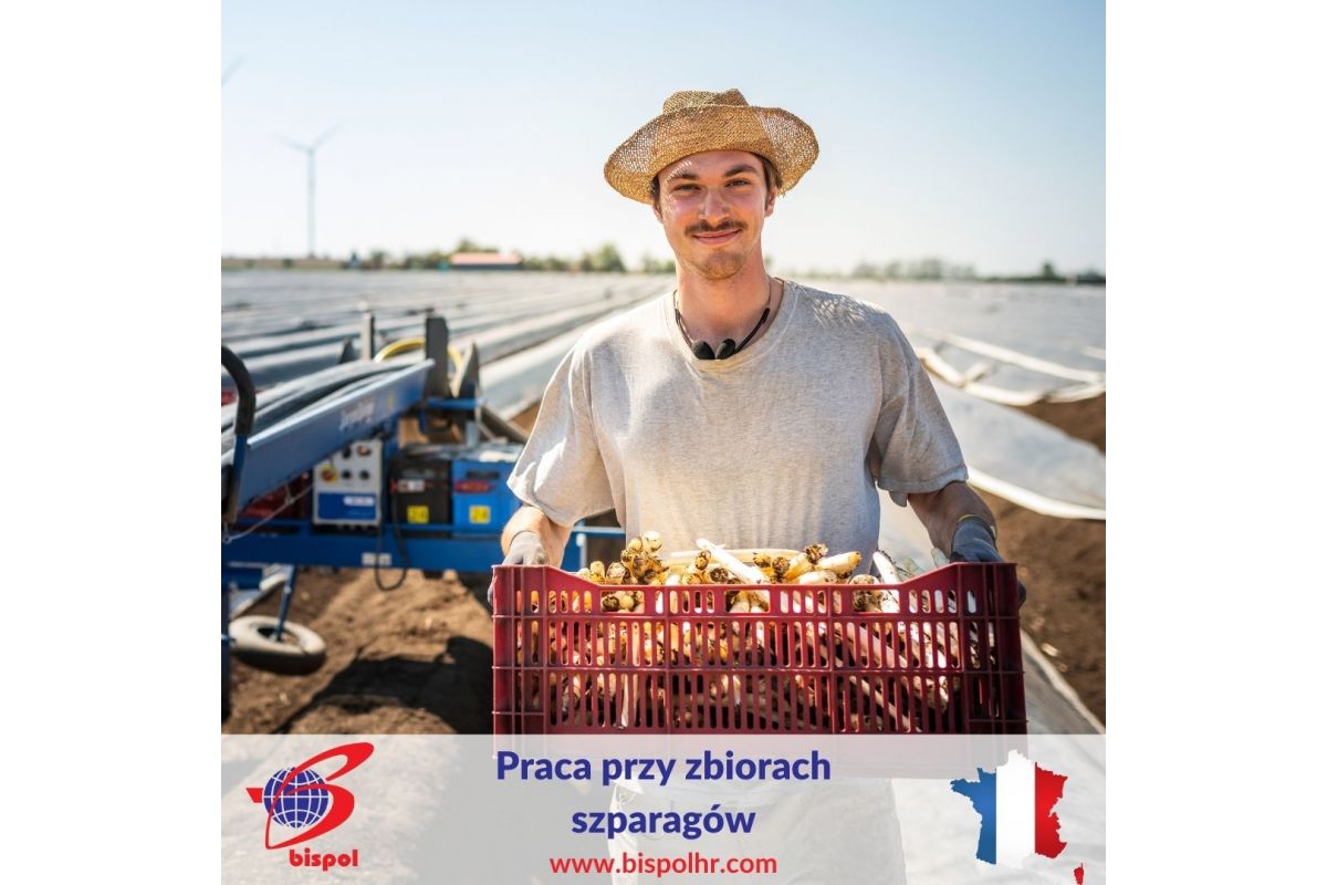 Praca we francuskim gospodarstwie rolnym przy zbiorze (wycinaniu) i sortowaniu białych oraz zielonych szparagów. Praca na polu przy zbiorach, utrzymaniu uprawy – wyrywaniu chwastów, spulchnianiu gleby oraz na hali przy sortowaniu. Szparagi są zbierane również podczas deszczu. Dodatkowo pracodawca może zlecić prace związane z przygotowaniem i pakowaniem szparagów do sprzedaży - mycie, oczyszczanie, ważenie, wiązanie. Wymagana jest gotowość do wykonywania wymagającej pracy fizycznej. Pracodawca oczekuje dużej motywacji do pracy oraz zaangażowania w wykonywane obowiązki. Poszukujemy 2 osób (może być para).